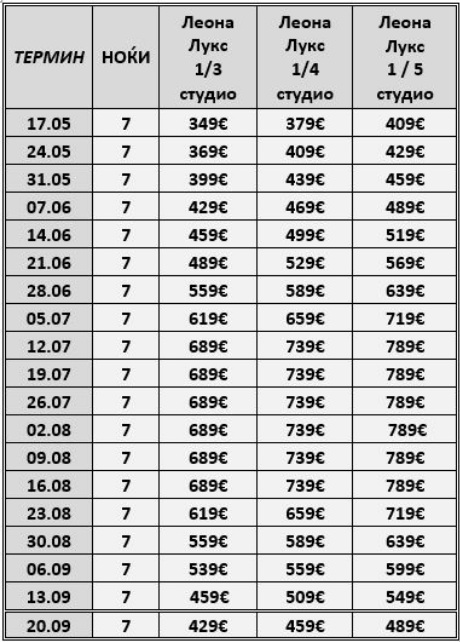 Цените се изразени во евра, за уплата во денарска противвредност 1€ = 62мкд. и се за наем на Студио за 7 ноки.
