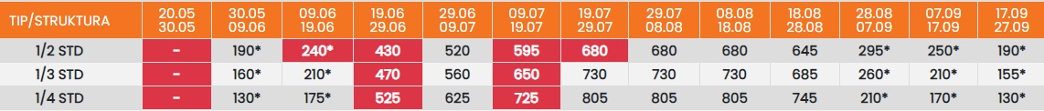 Цените означени со звездичка * се цени по лице за 10 ноки со вклучен превоз, За со сопствен превоз цената се намалува за 25еур по лице.