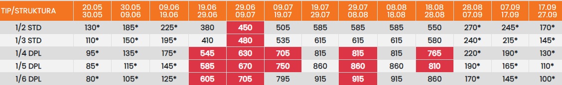 Цените означени со звездичка * се цени по лице за 10 ноки со вклучен превоз, За со сопствен превоз цената се намалува за 25еур по лице.