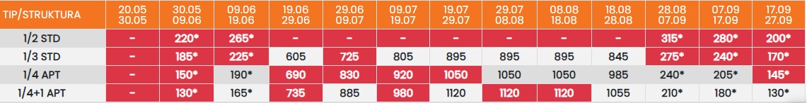 Цените означени со звездичка * се цени по лице за 10 ноки со вклучен превоз, За со сопствен превоз цената се намалува за 25еур по лице.