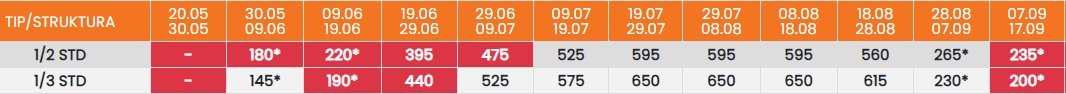 Цените означени со звездичка * се цени по лице за 10 ноки со вклучен превоз, За со сопствен превоз цената се намалува за 25еур по лице.