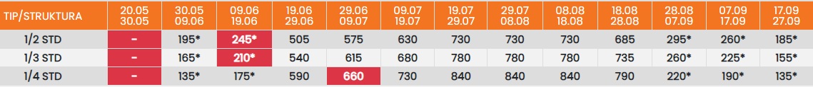 Цените означени со звездичка * се цени по лице за 10 ноки со вклучен превоз, За со сопствен превоз цената се намалува за 25еур по лице.