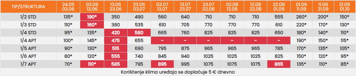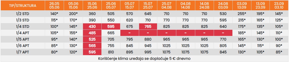 Цените се изразени во евра (1еур=62ден) за наем на апартман за 10 ноки.
