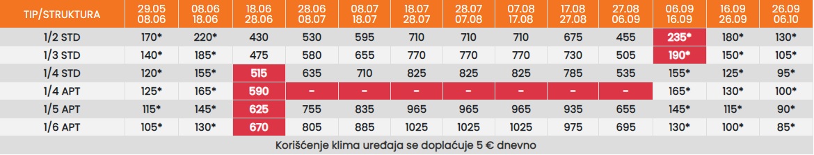 Цените означени со звездичка * се цени по лице за 10 ноки со вклучен превоз, За со сопствен превоз цената се намалува за 25еур по лице.