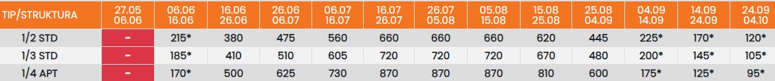 Цените означени со звездичка * се цени по лице за 10 ноки со вклучен превоз, За со сопствен превоз цената се намалува за 25еур по лице.