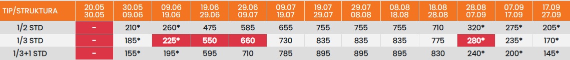 Цените означени со звездичка * се цени по лице за 10 ноки со вклучен превоз, За со сопствен превоз цената се намалува за 25еур по лице.