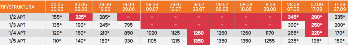 Цените во табелата со (*) се дадени по лице со превоз. За со сопствен превоз се одбива 25еур.