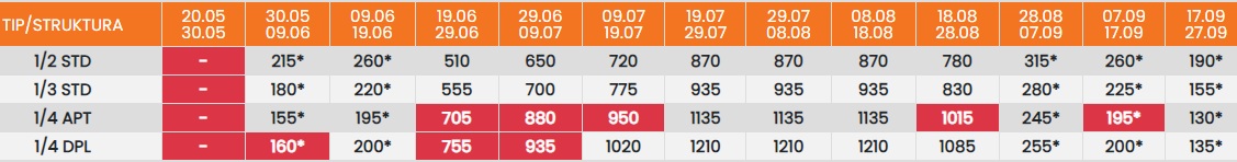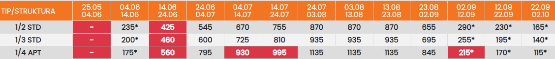 Цените во табелата со (*) се дадени по лице со превоз. За со сопствен превоз се одбива 25еур.