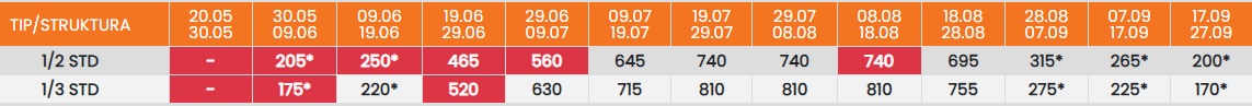 Цените означени со звездичка * се цени по лице за 10 ноки со вклучен превоз, За со сопствен превоз цената се намалува за 25еур по лице.