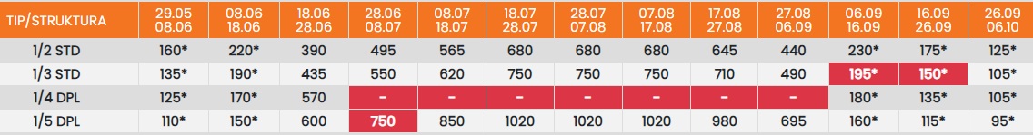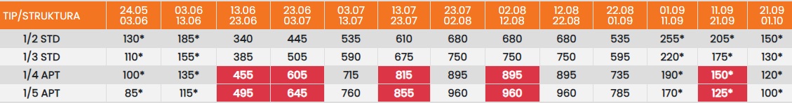 Цените означени со звездичка * се цени по лице за 10 ноки со вклучен превоз, За со сопствен превоз цената се намалува за 25еур по лице.