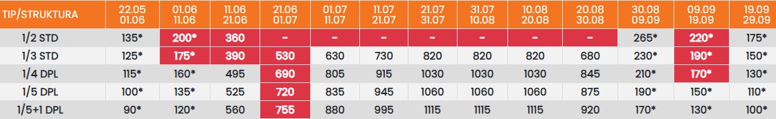 Цените означени со звездичка * се цени по лице за 10 ноки со вклучен превоз, За со сопствен превоз цената се намалува за 25еур по лице.