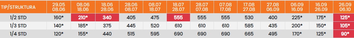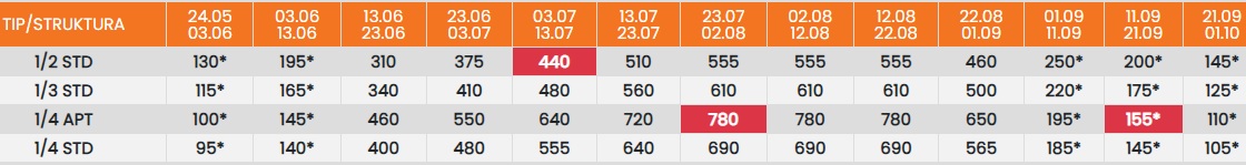 Цените означени со звездичка * се цени по лице за 10 ноки со вклучен превоз, За со сопствен превоз цената се намалува за 25еур по лице.