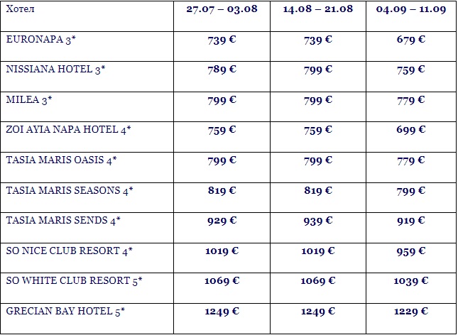 Состанок на групата на Скопскиот ареодром 2 часа пред лет. Полетување за Ларнакa во 16.20часот и слетување во 19.30часот. Организиран трансфер до хотелот во Аја Напа. Ноќевање.