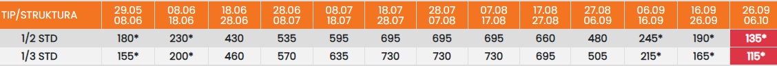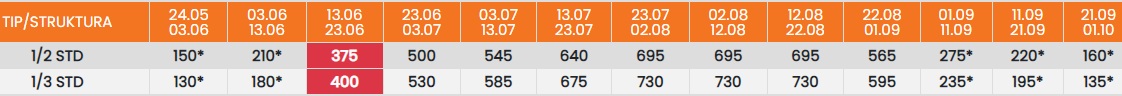 Цените означени со звездичка * се цени по лице за 10 ноки со вклучен превоз, За со сопствен превоз цената се намалува за 25еур по лице.