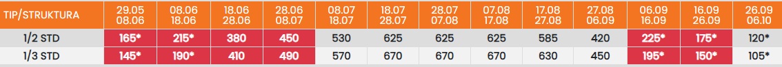 Цените означени со звездичка * се цени по лице за 10 ноки со вклучен превоз, За со сопствен превоз цената се намалува за 25еур по лице.