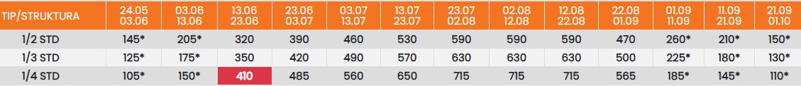 Цените означени со звездичка * се цени по лице за 10 ноки со вклучен превоз, За со сопствен превоз цената се намалува за 25еур по лице.