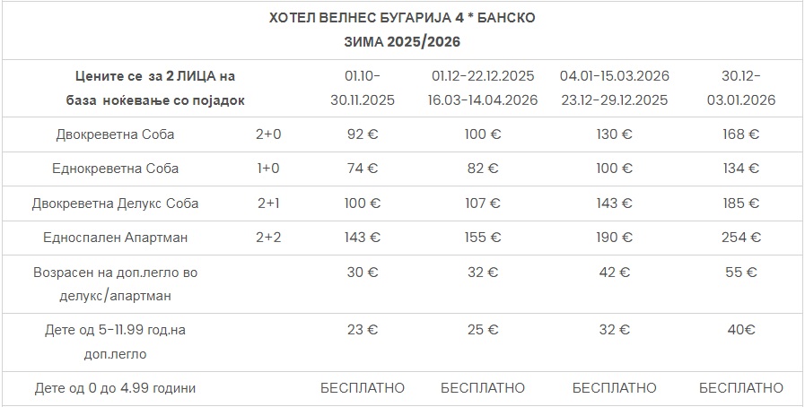 Во цената е вклучено : појадок,користење на внатрешен базен(минерална вода ) , џакузи, детски кат , сауна, парна бања, фитнес, интернет,ски гардероб,паркинг (гаража) – по достапоност