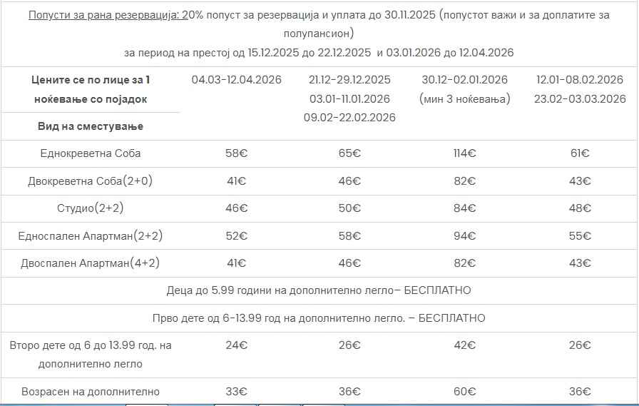Доплата за ПОЛУПАНСИОН : возрасен – 19€, дете (6-13.99 год.) – 10€