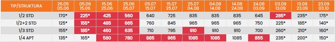 Цените во табелата со (*) се дадени по лице со превоз. За со сопствен превоз се одбива 25еур.