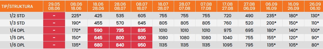 Цените означени со звездичка * се цени по лице за 10 ноки со вклучен превоз, За со сопствен превоз цената се намалува за 25еур по лице.