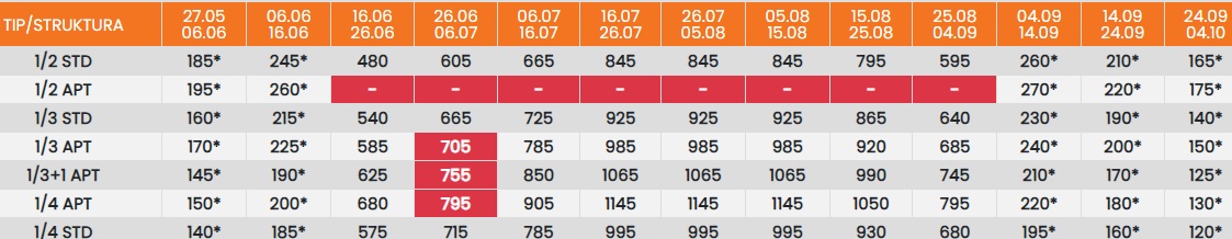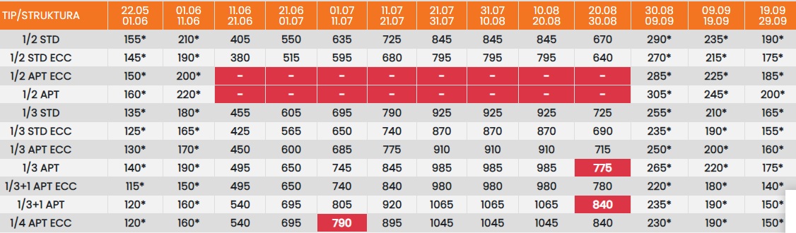 Цените во табелата со (*) се дадени по лице со превоз. За со сопствен превоз се одбива 25еур.