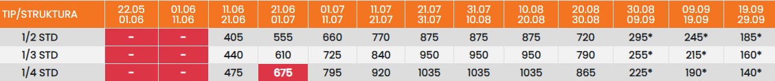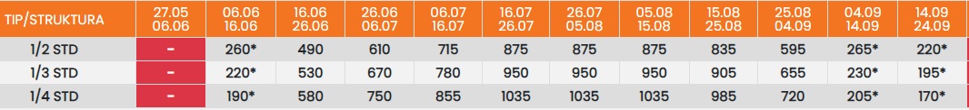 Цените во табелата со (*) се дадени по лице со превоз. За со сопствен превоз се одбива 25еур.