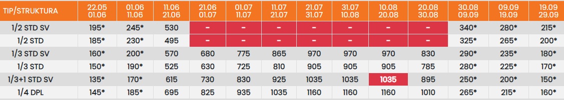 Цените означени со звездичка * се цени по лице за 10 ноки со вклучен превоз, За со сопствен превоз цената се намалува за 25еур по лице.