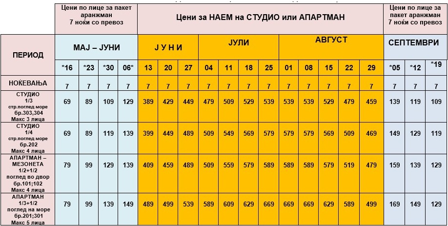 -ОСТАНАТИТЕ ЦЕНИ ЗА ДАДЕНИТЕ СМЕНИ СЕ ОДНЕСУВААТ ЗА НАЕМ НА СТУДИО ИЛИ АПАРТМАН ЗА 7 НОЌИ