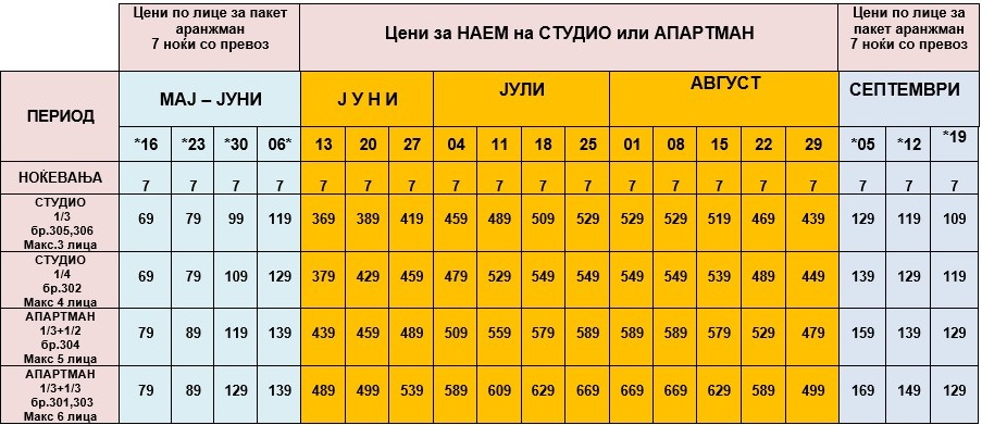 -ЦЕНИТЕ ОЗНАЧЕНИ СО ЗВЕЗДИЧКА * ВО ТАБЕЛАТА СЕ ПАКЕТ АРАНЖМАНИ И СЕ ДАДЕНИ ПО ЛИЦЕ ЗА 7 НОЌИ СО ВКЛУЧЕН АВТОБУСКИ ПРЕВОЗ