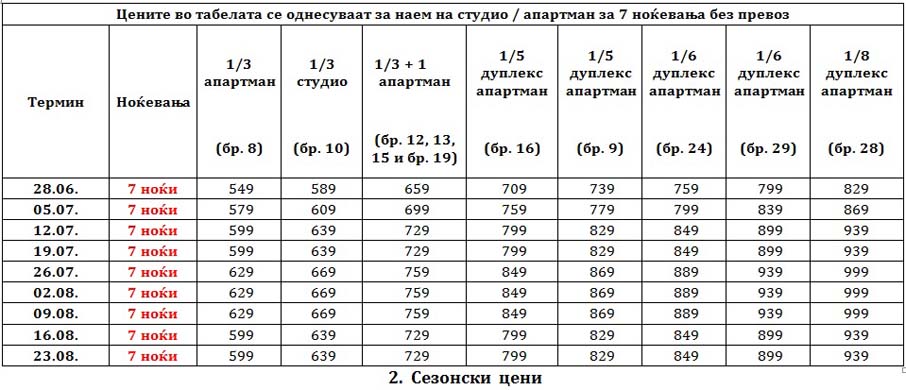- ЦЕНИТЕ ВО ТАБЕЛА БР.2 – СЕЗОНСКИ СЕ ДАДЕНИ ЗА НАЕМ НА СТУДИО/АПАРТМАН/ДУПЛЕКС ЗА 7 НОЌЕВАЊА, според бројот на кревети во секоја соба, без вклучен превоз, а истиот се доплаќа: