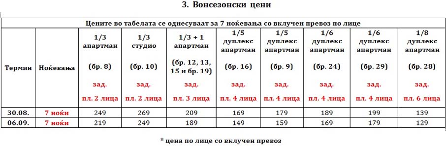 - ЦЕНИТЕ ВО ТАБЕЛА БР.1 и 3 – ВОНСЕЗОНСКИ СЕ ДАДЕНИ ПО ЛИЦЕ ЗА ПАКЕТ АРАНЖМАН – 7 НОЌЕВАЊА СО ВКЛУЧЕН ПРЕВОЗ.
