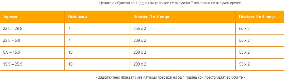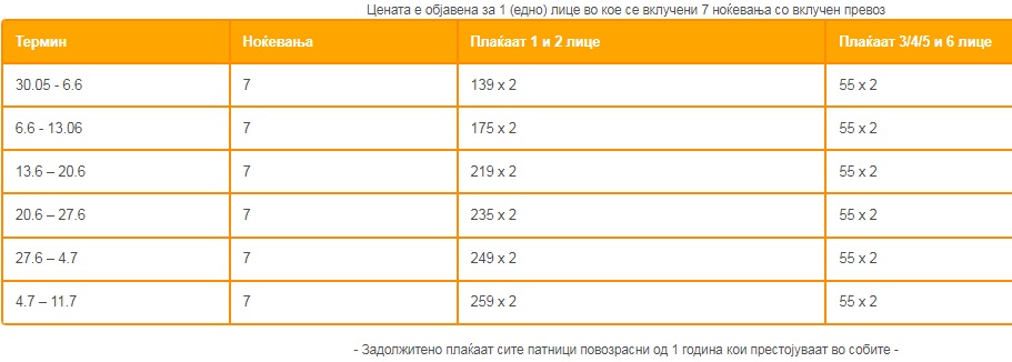 Цените во табелите 1 и 3 се објавени за 1 (едно) лице за 7 ноќевања со вклучен автобуски превоз. Доплатата за 3 и 4 лице (во зависност од бројот на кревети) е задолжителна, плаќаат сите лица кои престојуваат а кои се повозрасни од 1 година.