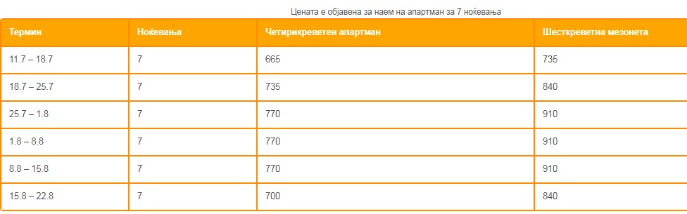 Цените во табела 2 се дадени (објавени) за наем на цело студио или апартман за 7 ноќевања.