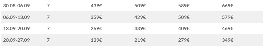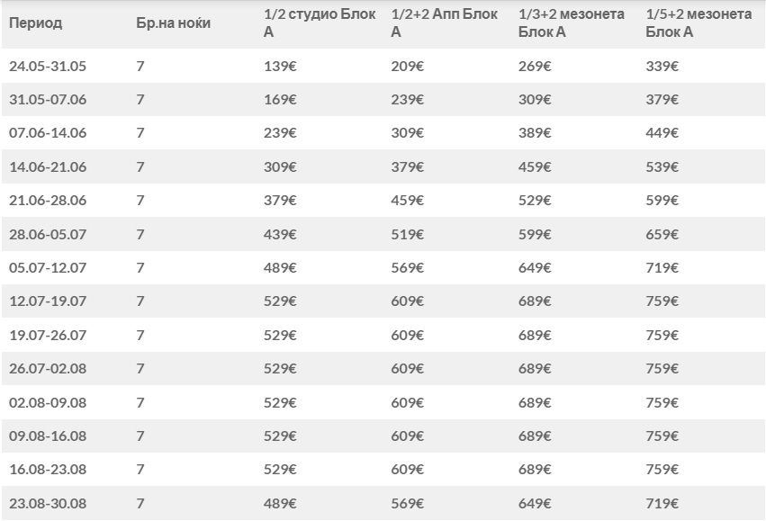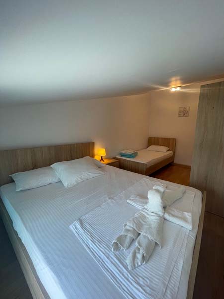 - Апартман 1/2+2- спална соба со брачен кревет, одделена опремена кујна во која има софа на спуштање, ТВ, бања со фен, тераса.
