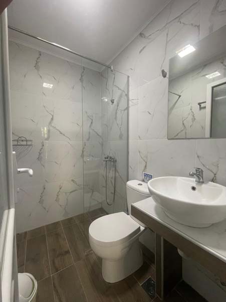 - Апартман 1/5+2- на горниот кат една спална соба со брачн кревет и една спална соба во брачен и единечен кревет, на долниот кат одделена опремена кујна со аголна гарнитура на спуштање, ТВ, бања со фен, тераса.