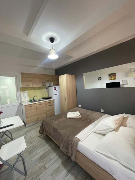 - Студио 1/2- брачен кревет, опремена кујна, ТВ, бања со фен, тераса.