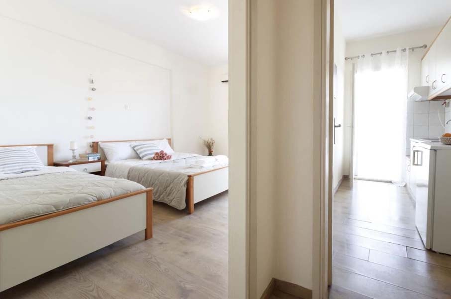 Вилата ПОПИ се наоѓа во мирен дел во самиот центар на градот на само 150 метри од плажа. Секој апартман е опремен со кујна, бања, балкон, ТВ, WiFi и клима уред. Сите апартмани се наоѓаат на приземје. Собите располагаат со еден дупли и еден единечен кревет. Гледаат кон дворот.