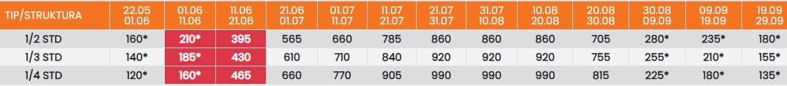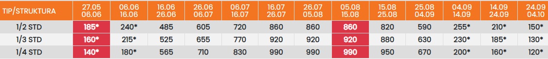 Цените во табелата со (*) се дадени по лице со превоз. За со сопствен превоз се одбива 25еур.