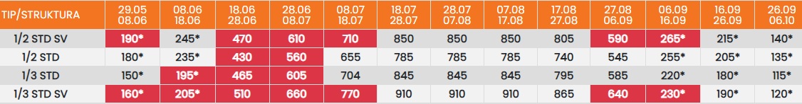 Цените означени со звездичка * се цени по лице за 10 ноки со вклучен превоз, За со сопствен превоз цената се намалува за 25еур по лице.