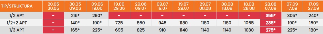 Цените во табелата со (*) се дадени по лице со превоз. За со сопствен превоз се одбива 25еур.