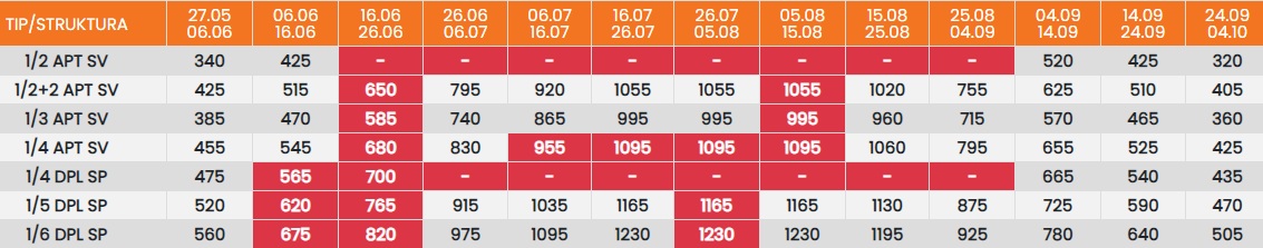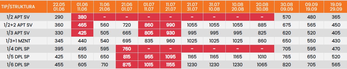 Цените во табелата со (*) се дадени по лице со превоз. За со сопствен превоз се одбива 25еур.