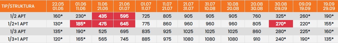 Цените означени со звездичка * се цени по лице за 10 ноки со вклучен превоз, За со сопствен превоз цената се намалува за 25еур по лице.