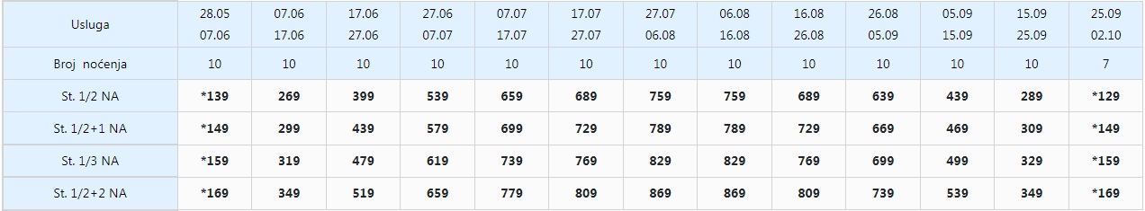 Цените се изразени во евра (1еур=62ден) за наем на апартман за 10 ноки.