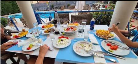Хотелот нуди полупансион (HB) – појадок и вечера на база на шведска маса. Оброците се разновидни, со комбинација на домашна и медитеранска кујна. Секојдневно се врши одржување на чистотата, а постелнината и пешкирите се менуваат редовно. Гостите во своите рецензии ја истакнуваат љубезноста на персоналот, чистите соби и убавата организација на плажата.