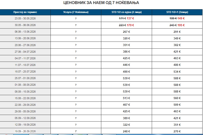 ** Во студио/апартман дозволено е сместување на лица согласно предвидениот капацитет (број на кревети), преку дозволениот број може да се смести максимум едно дете до 6 години во кревет со родител, со одобрение од сопственикот на објектот.