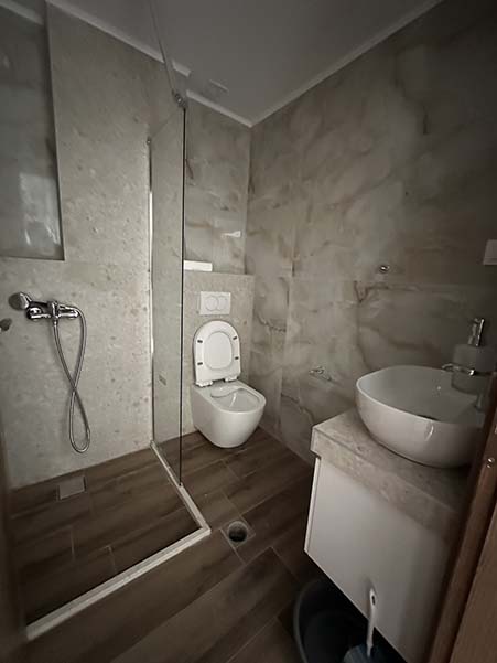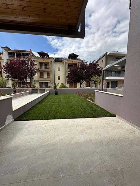 1/2+2 апартман бр. 1 – приземје. Простран апартман кој располага со голема спална соба опремена со два единечни кревети кои може да се спојат по желба од која се излегува на сопствена тераса со поглед кон дворот. Располага со пространа дневна соба со целосно опремена кујна со сите потребни елемнти (голем фрижидер, голем шпорет со рерна, кујнски прибор, аспиратор и сл.), ТВ и клима уред. Во дневниот простор има голема гарнитура на пуштање за 2 поголеми деца или еден возрасен и дете до 12 години. Од дневна соба се излегува на втората пространа тераса која има поглед кон улицата напред. Апартманот има сопствено ново купатило со туш кабина.