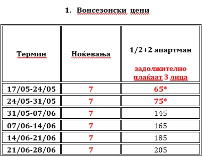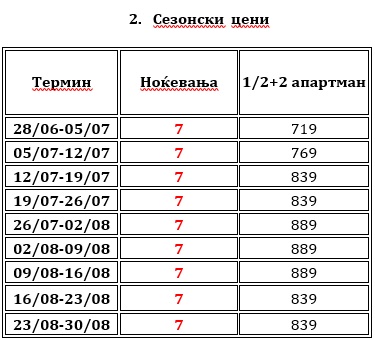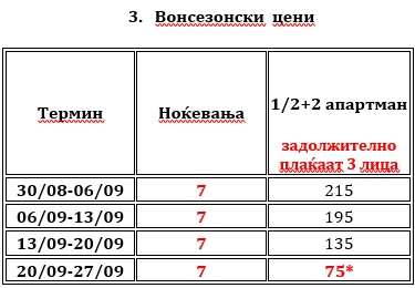 Цените во табелата се однесуваат за наем на апартман за 7 ноќевања без превоз