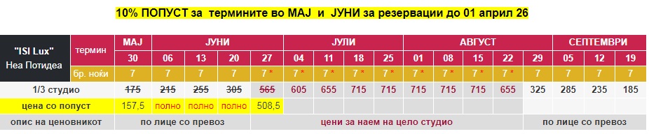 - – Цените за 7ноќи / 8дена (со *), се дадени за наем на цело студио без вклучен превоз;