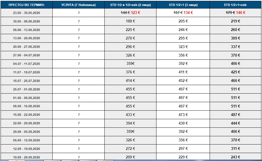 - Цените во табелата се однесуваат за наем на студио/апартман за 7 ноќевања (без превоз).