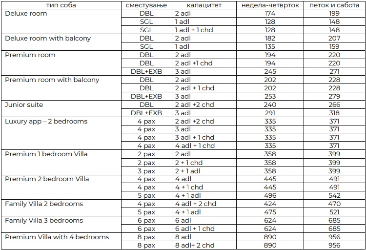 релаксација, фитнес, паркинг, детско игралиште, сеф, туристичка такса,